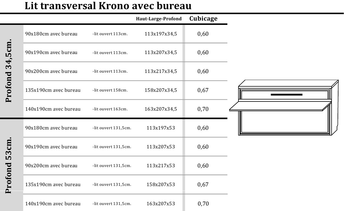 Lits fermés, il prend l'encombrement d'une armoire, avec 2 profondeurs au choix de 34.5 ou 55 cm. Son utilisation est facile, son lit s'ouvre d'un geste simple, assisté par deux solides vérins.